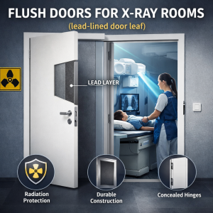 Flush doors for X-ray rooms are специально designed for spaces requiring radiation protection. The door leaf is equipped with an internal lead layer that effectively blocks X-ray radiation.